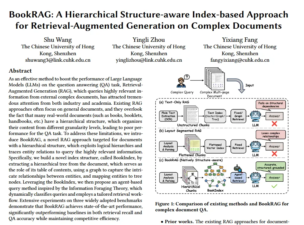 本文介绍BookRAG,一种针对具有层次结构的复杂文档设计的创新RAG方法,通过构建文档原生索引和智能体检索显著提升问答准确性。