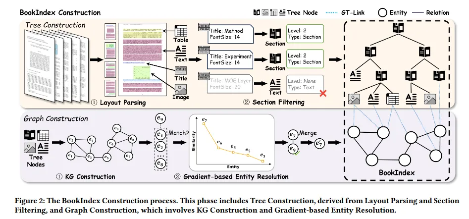 BookRAG构建了一个文档原生的BookIndex,通过将文档布局块的层次树与存储细粒度实体关系的知识图谱集成在一起。