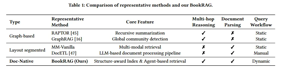 从对比中可以看出,BookRAG是唯一同时具备多跳推理能力、文档解析能力和动态查询工作流的方法。