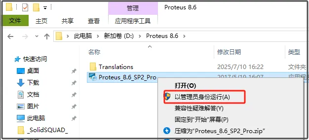第三步:打开解压后的文件夹,找到【Proteus_8.6_SP2_Pro】安装程序,右击【以管理员身份运行】。
