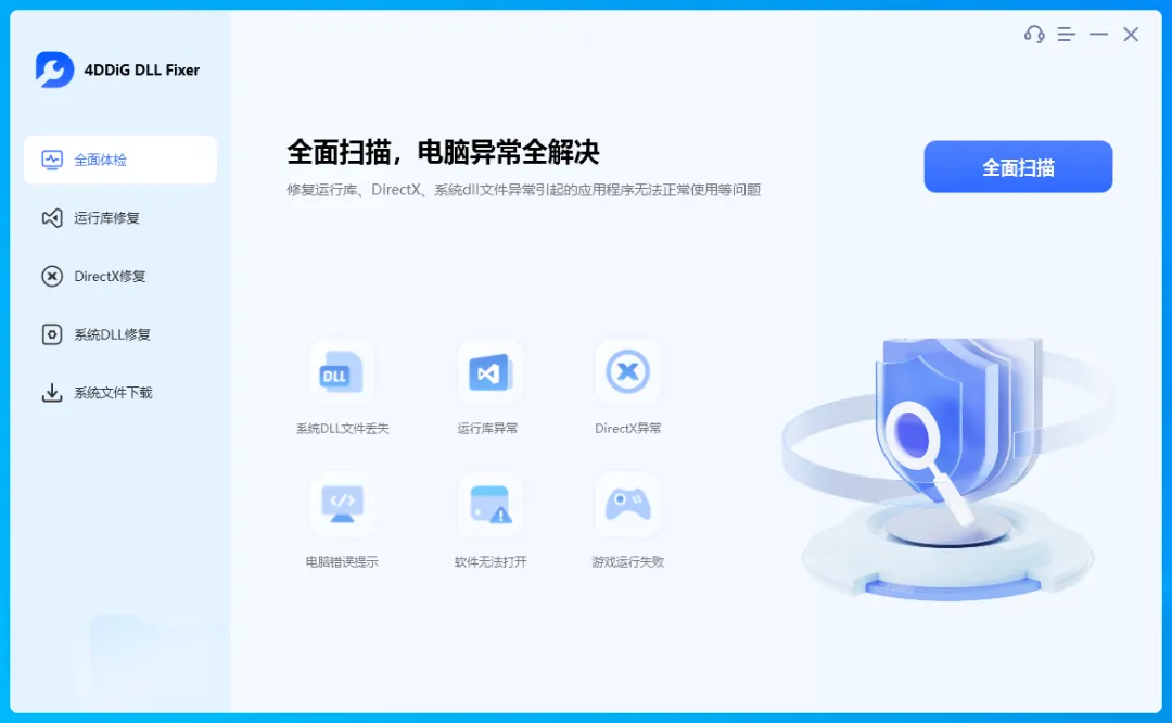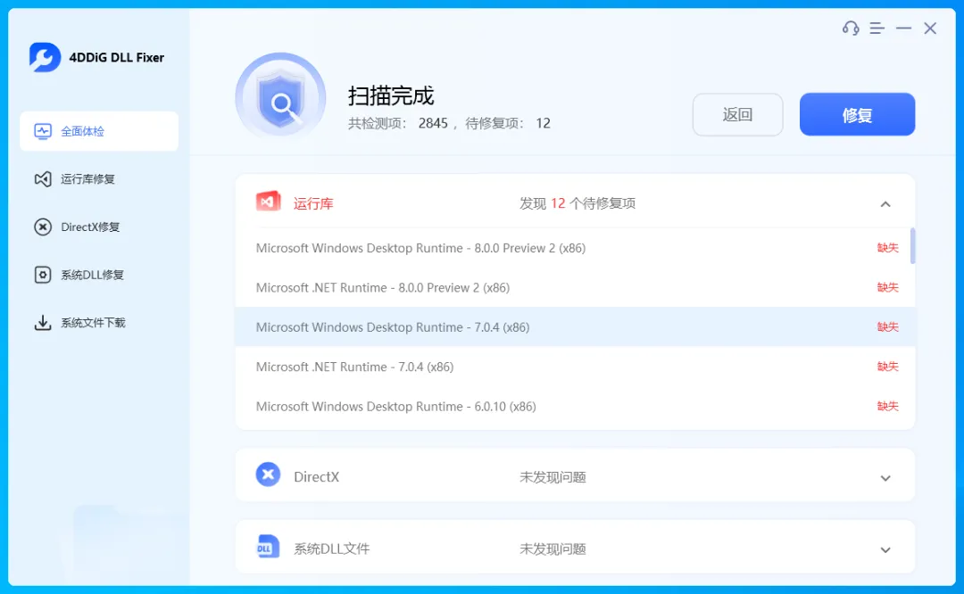 点击全扫描,会自动扫描电脑中运行库、DirectX、系统DLL等文件的缺失情况