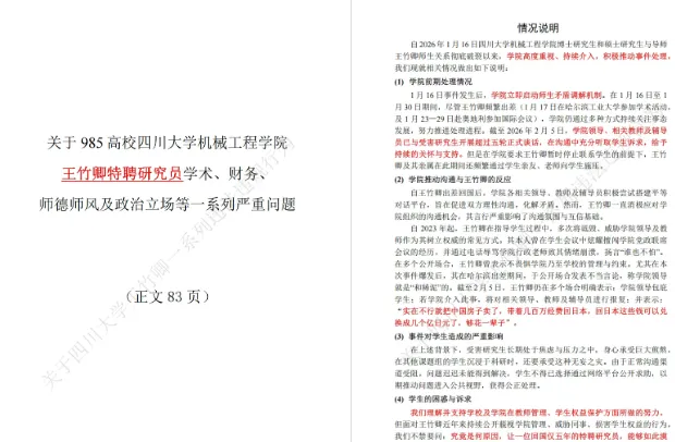 【吃瓜分享】四川大学83页PDF!王竹卿83页举报信事件pdf完整版下载 0208 获取资源方法 可根据下方操作顺序直接搞定: 1.长按上面的链接,移动两个绿色光标 直到字母全部变绿,点击搜一搜 2.然后点访问网页直接进入网盘,找到想要的资源 保存后下载到手机即可游玩 四川大学王竹卿83页举报信: https://pan.quark.cn/s/2df016719b1f 近日,四川大学某课题组多名在读硕博研究生联合举报王竹卿,并制作了长达83页的PDF材料作为依据,指控内容涉及学术不端、侵占经费、师德失范等。 2026年2月5日,四川大学某课题组多名在读硕博研究生联名举报导师王竹卿,指控其存在学术不端、侵占经费、师德失范等问题,并提交了长达83页的PDF材料作为证据。校方于次日(2月6日)发布通报称已成立工作专班启动调查,若查实将严肃处理。