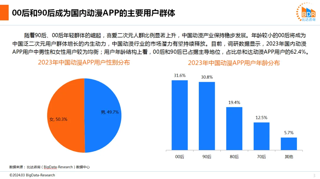 随着90后、00后年轻群体的崛起,喜爱二次元人群比例显著上升,中国动漫产业保持稳步发展。年龄较小的00后将成为中国泛二次元用户群体增长的内生动力,中国动漫行业的市场潜力有望持续释放。目前,调研数据显示,2023年国内动漫APP用户中男性和女性用户较为均衡;用户年龄结构上看,00后和90后已占据主导地位,占比总和达动漫APP用户的62.4%