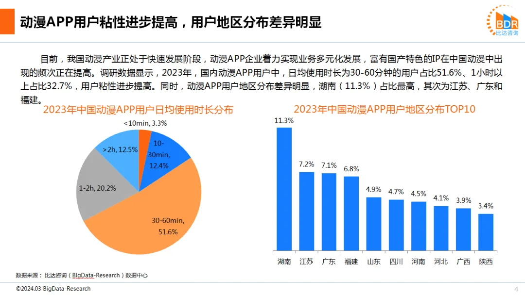 目前,我国动漫产业正处于快速发展阶段,动漫APP企业着力实现业务多元化发展,富有国产特色的IP在中国动漫中出现的频次正在提高。调研数据显示,2023年,国内动漫APP用户中,日均使用时长为30-60分钟的用户占比51.6%1小时以上占比32.7%,用户粘性进步提高。同时,动漫APP用户地区分布差异明显,湖南(11.3%)占比最高,其次为江苏、广东和福建。
