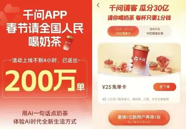 2月6日千问拉新推广上线春节30亿大免单,9小时订单量就超过1000万单…