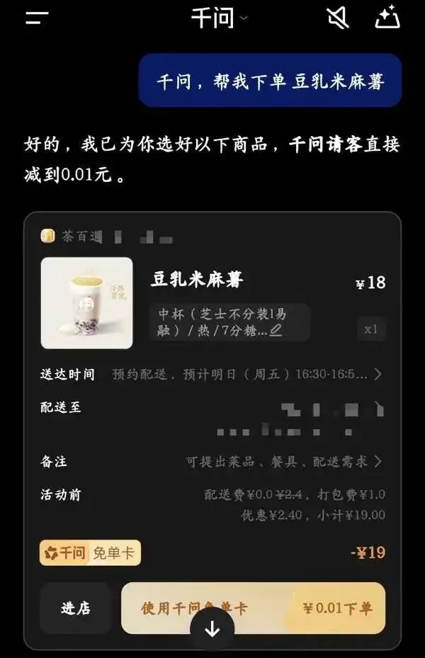 我也没忍住,赶紧更新了一下千问app最新版本,顺手点了一杯豆乳米麻薯。