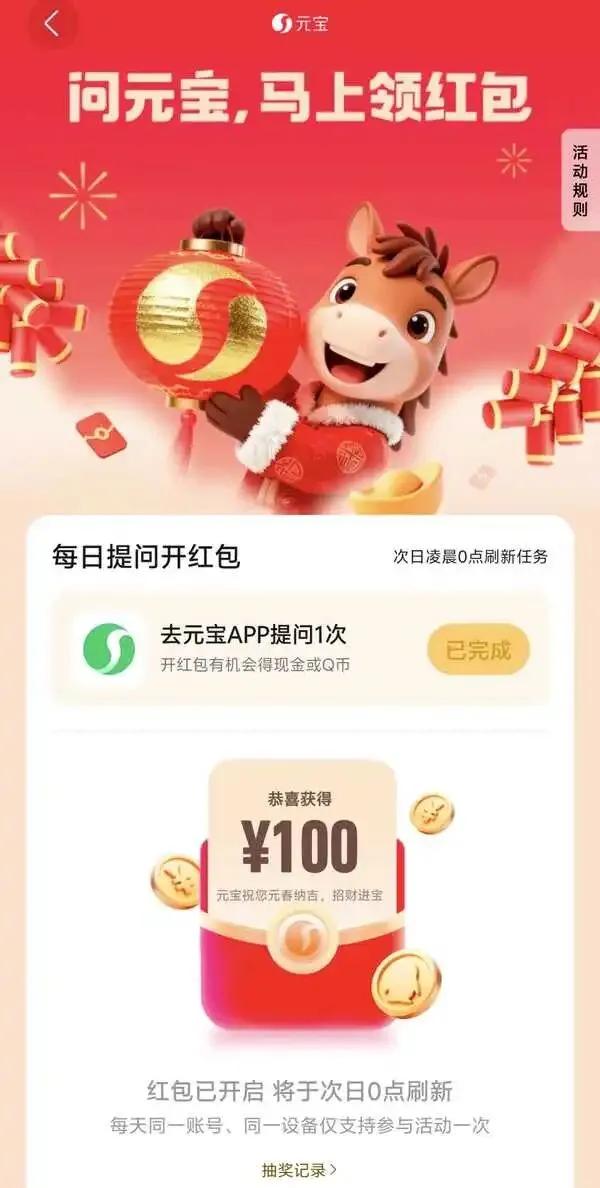 咱们来看看隔壁腾讯的元宝,元宝最近也在撒币,真金白银地往用户脸上怼红包,简单粗暴。