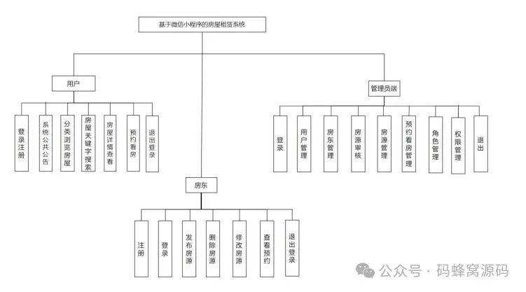 房屋租赁系统的重要核心功能包括首页、系统公告管理、用户管理、房源管理、系统公告管理、支付方式管理、购物车管理、系统公告房东管理、系统公告收藏管理、轮播图管理等,以下为项目功能模块图: