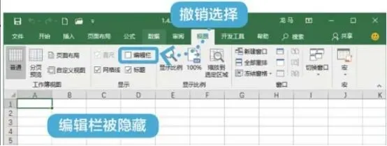 单击【视图】→【显示】组,撤销选择【编辑栏】复选框,即可取消编辑栏的显示。