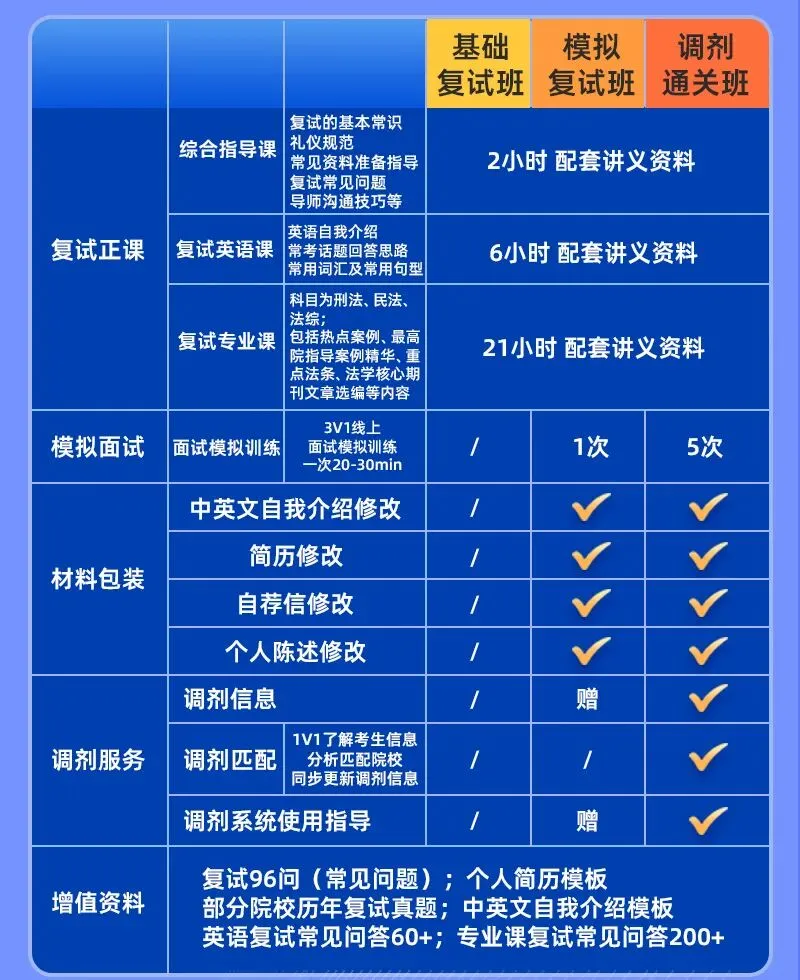 厚大推出基础复试班、模拟复试班、调剂通关班三大辅导方案,从基础备考到模拟演练再到调剂兜底,全方位帮你解决复试难题,助力你稳中求进或逆风翻盘!