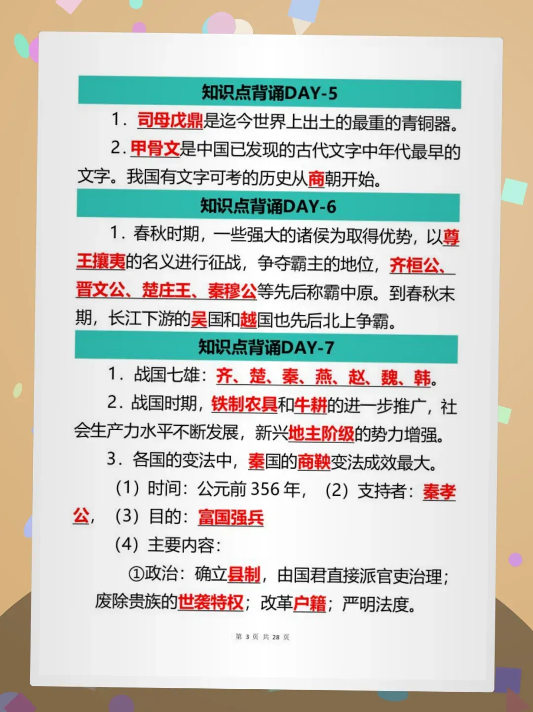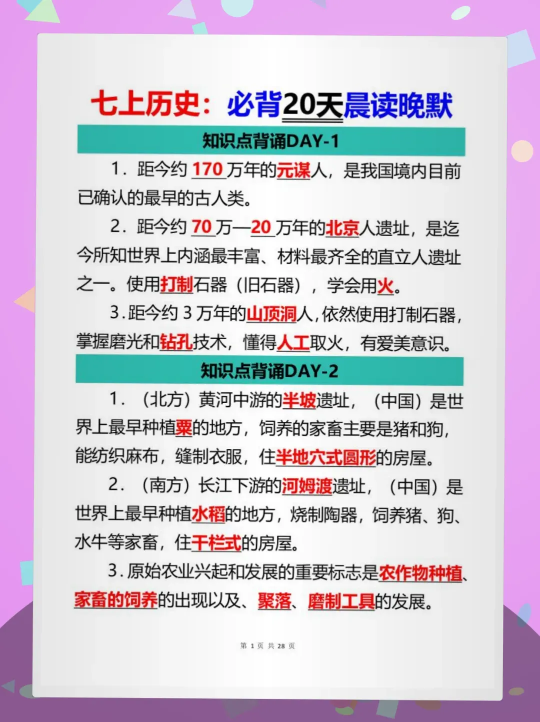 ✅核心亮点:紧扣部编版七上历史教材,20天科学规划,每日1页精炼考点+口诀记忆法,覆盖元谋人→南北朝全部重点,含时间轴/对比表格/易混辨析,专为初中生设计!
