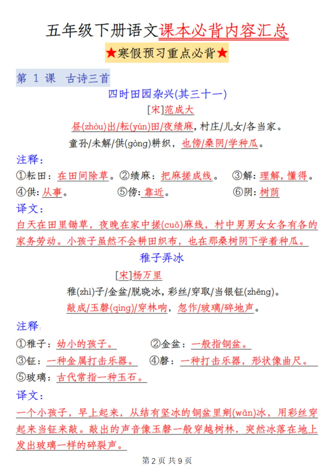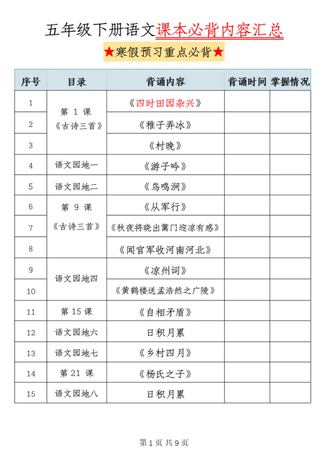 【免费下载】五年级(下)语文 课本必背内容汇总,PDF电子版,可打印