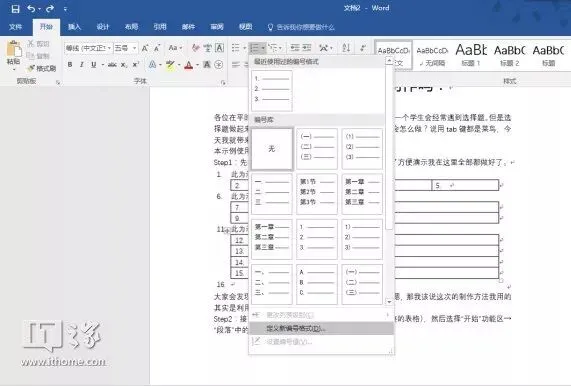Step2:接下来选中表格(不是只选一个,而是选中完整的表格),然后选择“开始”功能区→“段落”中的“编号”旁边的下拉三角形,然后在弹出的菜单中选择定义新编号格式