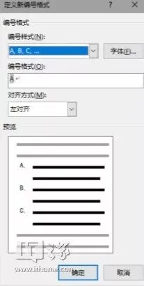 在打开的“定义新编号格式”对话框中,编号样式选择“A,B,C,…”样式,编号格式设为“A.”,对齐方式选择左对齐,确定。