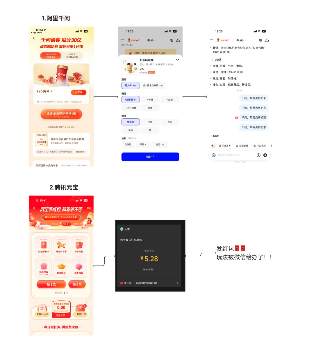 一样发钱,发红包,千问比元宝做的更有意义,千问结合了自己的业务,本地外卖业务,但是崩了,点不了,两家大公司算是殊途同归了。