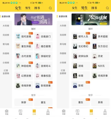 七猫小说–进入软件之后就可以看到界面了,分为男生和女生,不同分类肯定是不同的,可以选择一个你喜欢看的分类,点击进去就可以看到很多小说了!