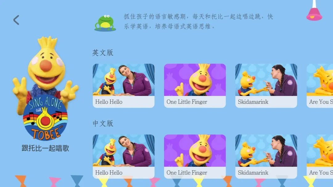零基础英语启蒙的孩子,二宝爸强烈推荐你们给娃看Super Simple Songs和《跟托比一起唱歌》。动画类视频加上真人示范互动节目,情景和动作与歌词的对应,帮助孩子更好理解英文。父母若是带着孩子一起看《跟托比一起唱歌》,边唱边跳,既玩得开心又学习了英文。