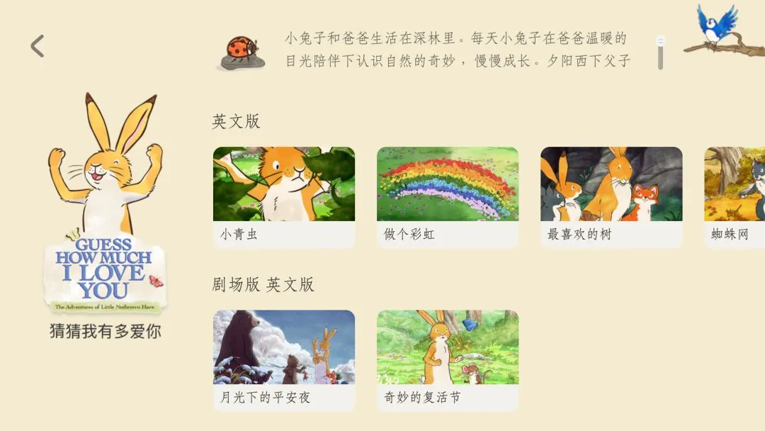 例如,Super Simple Songs全系列,以及畅销全球的经典绘本《猜猜我有多爱你》的同系列动画片。