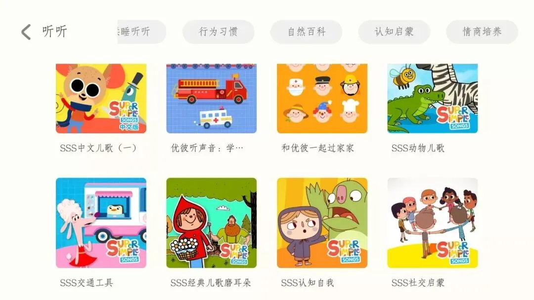小小优趣APP中,有一个“听听”模块,外出车中以及睡觉前,我都会给姐弟听这些音频。内容包含了儿歌、音乐、故事、自然百科、认知等方面。因为这个模块是新开发的,内容增加很快,我这几天每天打开几乎都会看到新增内容。