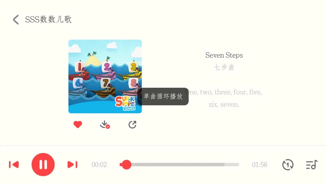而且,专辑还给到了内容主题的分类,可以看下图,Super Simple Songs的儿歌就有中文版、好习惯主题、数字主题、交通主题、社交主题、经典儿歌等主题分类。而且专辑内可以按照列表播放,还可以单曲循环。这种贴心的设置,真的不喜欢都难啊。