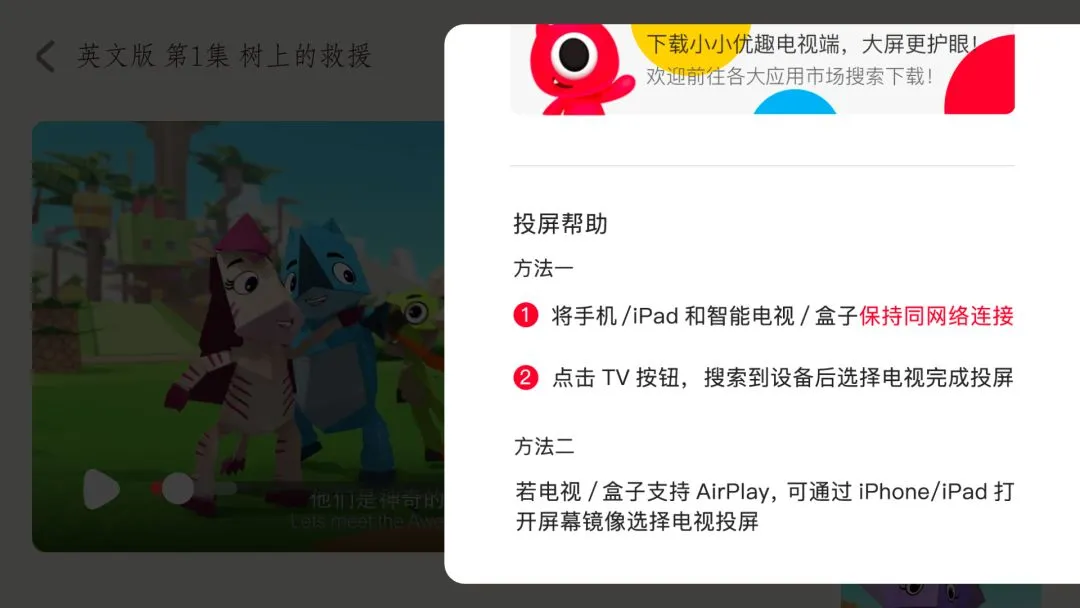 而最让我这个理工男爸爸拍手叫好的,是它的电视投屏功能,以及可以直接下载电视版的小小优趣,支持绝大多数智能电视和盒子。