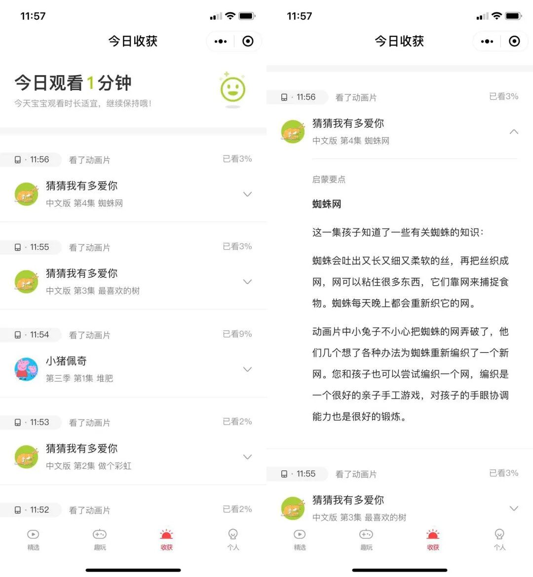 小小优趣还为家长提供了当天观看内容的启蒙要点。就算我没空陪孩子看动画片,也能和孩子一起交流、互动。