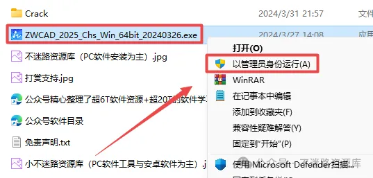 2.打开刚刚解压的文件夹,鼠标右键点击“ZWCAD_2025_Chs_Win_64bit_20240326.exe”选择“以管理员身份运行”、