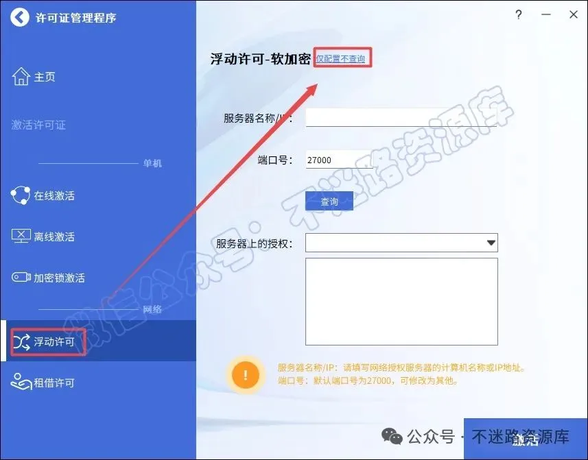 16.点击左侧“浮动许可“,点击“仅配置不查询“