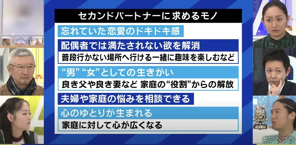 为4万对夫妇提供过帮助的婚姻问题研究者冈野淳子指出,很多人在拥有“第二伴侣”后,和丈夫、妻子的关系反而变得缓和。对配偶的愤怒、不满开始消退,埋怨与辱骂也大幅减少。