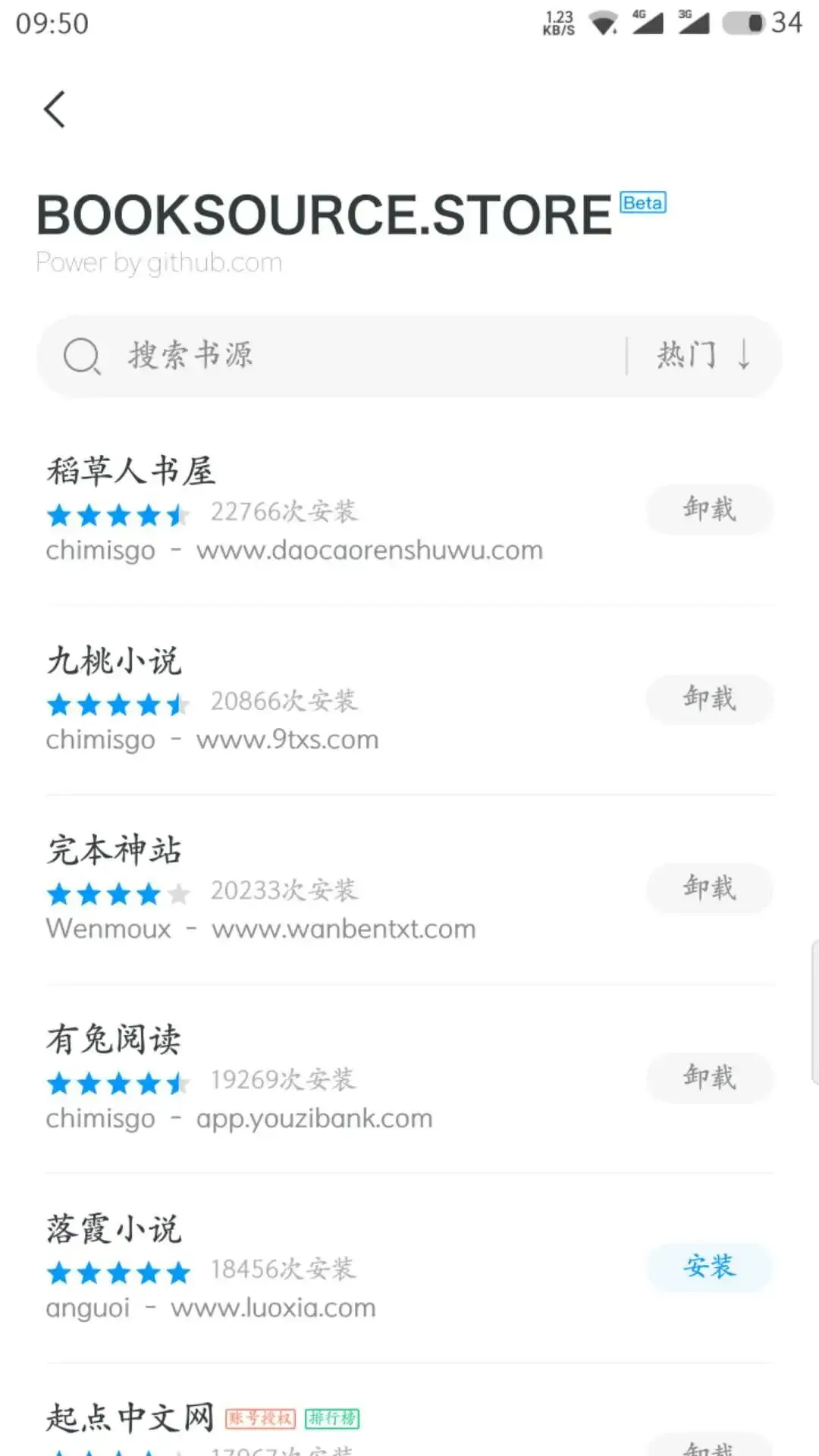 容器里要装的“饮料”,自然就是:书源。依次点击右边的“发现”→书源→书源商店,你会看到,这里有将近一百个书源可以选择,都可以直接安装的。