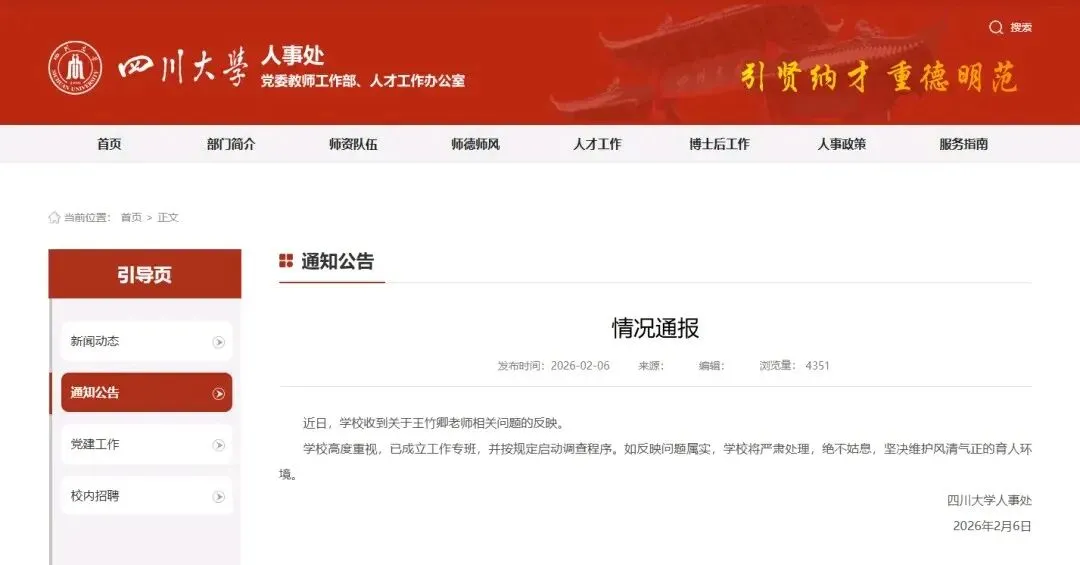 而校方的反应则走了“简洁风”,2月6日四川大学人事处发布的通报只有短短几十个字,核心意思就是“收到举报了,成立专班调查了,属实就严肃处理”。网友调侃道:“学生83页长篇大论,学校几十个字回应,这反差感简直拉满,颇有‘事越大字越少’的精髓。”
