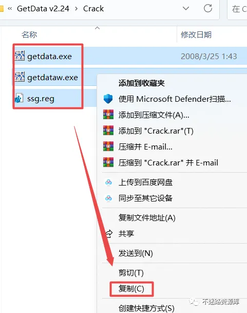 11.返回之前解压的“GetData v2.24”文件夹,双击打开“Crack”文件夹,选中该文件夹的下的全部文件,鼠标右键选择“复制”