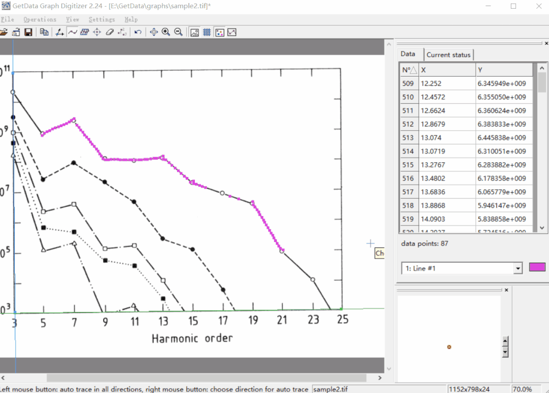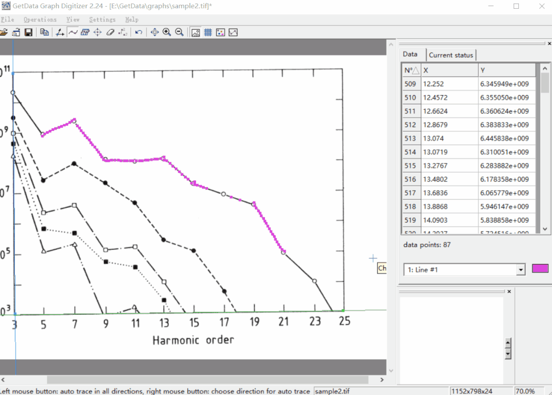 目前此软件提供了多种数据提取方式,如Auto trace lines(自动线追踪)、Digitire area(区域提取)、Point capture mode(点捕捉)、Data points eraser(数据点擦除)。在操作工具栏选中对应的功能图标即可开始操作。右侧可以实时显示数据以及选取线的放大图,使得数据提取更加准确,操作也更方便。