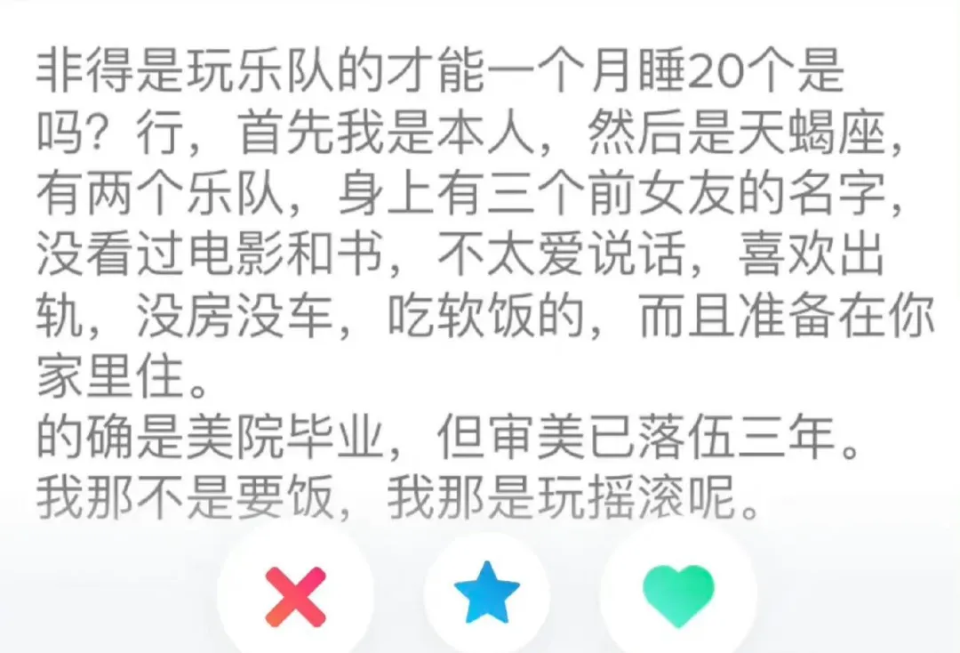 自己的照片要有一张,基本是长发,唱民谣的直发飘飘,玩摇滚的头发卷曲。