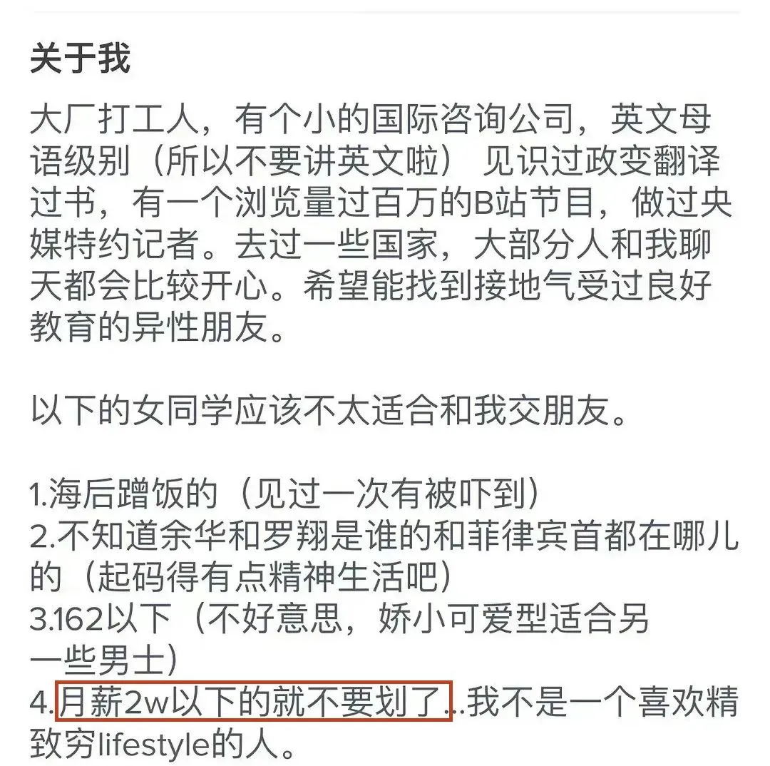 身高小于162的勿扰,月薪低于2万的也基本没戏。