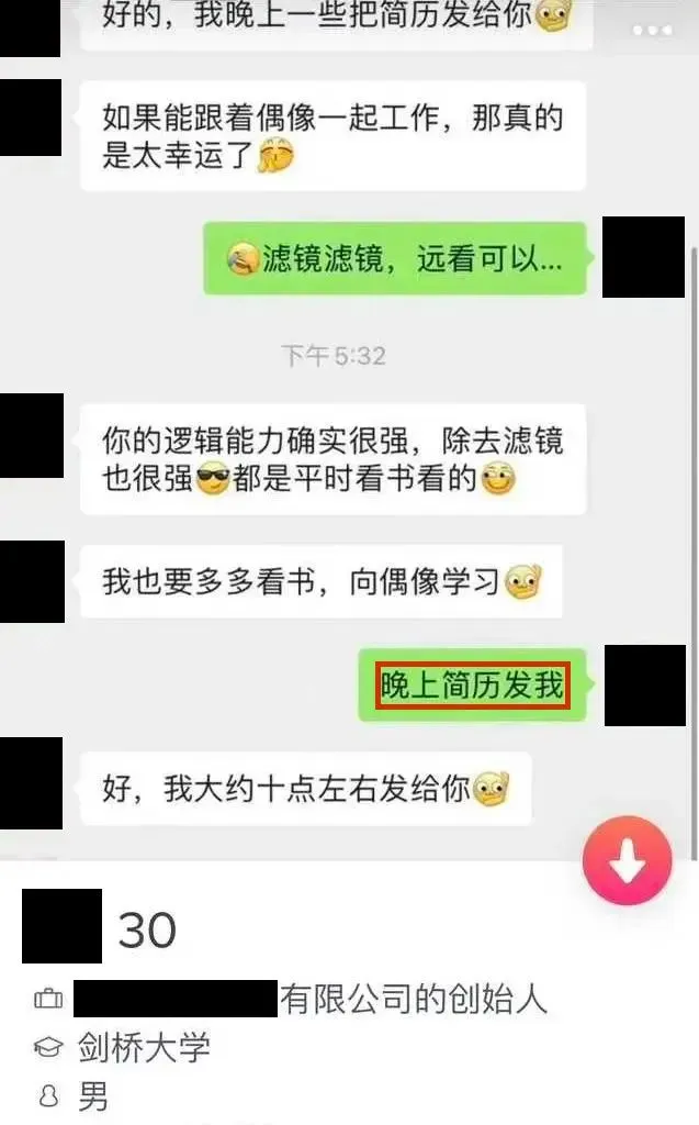 有的精英人士会打着帮你内推简历的旗号,先是骗取女孩的信任。