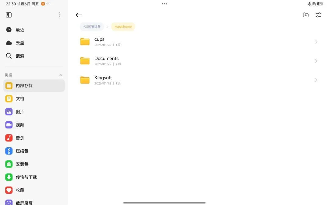 第2步:选择【内部存储】,在右侧找到【HyperEngine】文件夹。