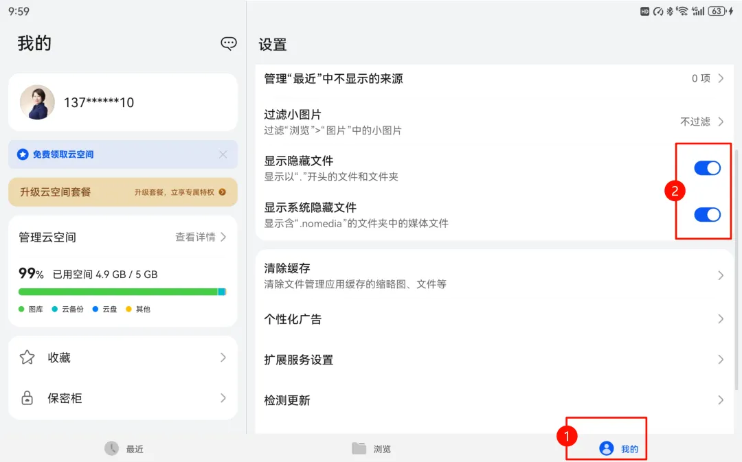 第2步:在【我的】界面,设置【显示隐藏文件】【显示系统隐藏文件】为打开状态,这个非常重要,不然后续没有办法操作