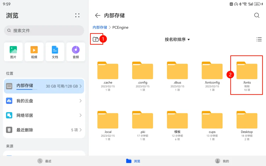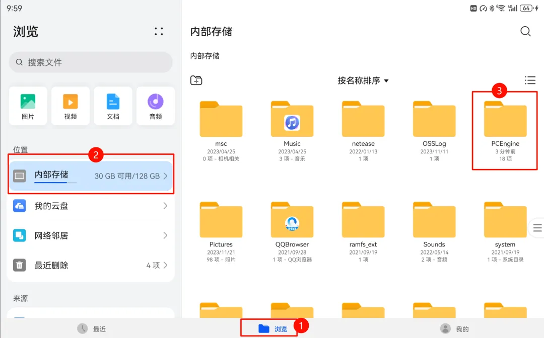 第3步:在【浏览界面】,通过左侧的【内部存储】,在右边文件夹中找到并找开【PCEngine】文件夹