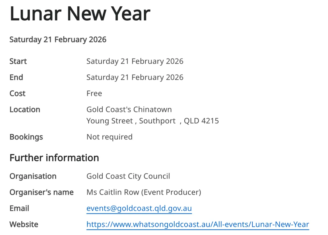 唐人街官方庆典:在2月21日(周六),南港(Southport)的唐人街将举行免费的农历新年庆典。