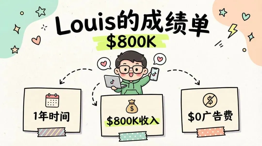 他的打法跟传统的“烧钱买量”完全相反——纯靠 TikTok 有机流量,零成本获客,1 年时间做到 80 万刀收入。