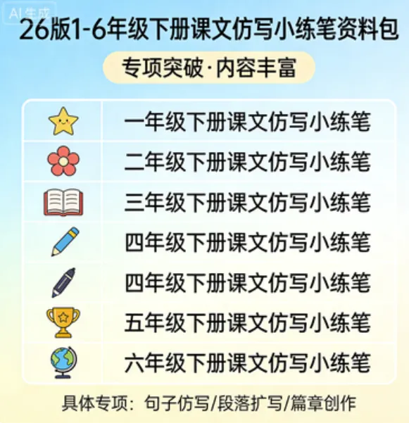 这套资料适合家长在家辅导孩子完成语文作业,也可作为课堂补充材料。通过系统的仿写训练,学生不仅能巩固课本知识,还能提高语言组织能力和写作兴趣。建议家长下载后打印使用,让孩子每天坚持练习,逐步提升语文综合素养。