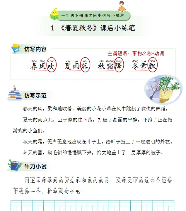 一年级下册的仿写内容以基础句式和简单描写为主,如《春夏秋冬》中的“春风吹、夏雨落、秋霜降、冬雪飘”等主谓短语,引导学生学习事物名称加动词的表达方式。通过仿写示范,学生可以掌握如何将简单的词语扩展成完整的句子。例如,春天的风被描写为“柔柔和地吹着”,并加入具体情境,如“小花小草在风中跳起了欢快的舞蹈”。每个练习后设有“牛刀小试”环节,让学生尝试独立运用所学方法进行扩写。