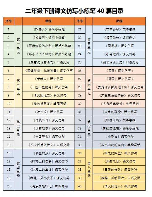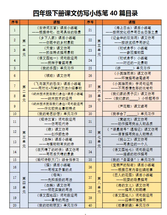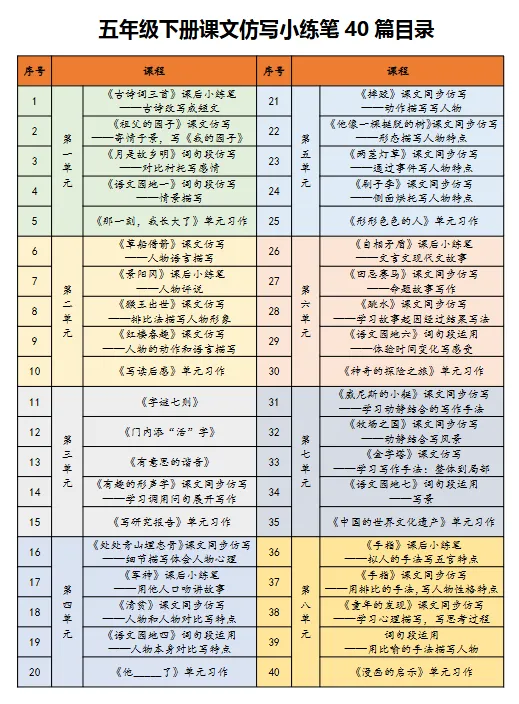 该文档是一套针对小学一至五年级学生的语文仿写练习资料,内容涵盖各年级下册教材中的课文同步仿写训练。每册资料包含40篇小练笔,按照教材单元顺序编排,与课本内容紧密对应。每一篇练习都围绕特定课文设计,旨在帮助学生在理解课文的基础上进行语言模仿和表达训练。