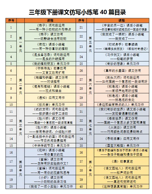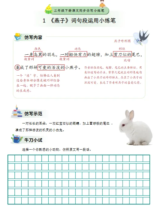 三年级下册的仿写内容更加丰富,涉及词句运用、人物描写、场景刻画等多个方面。以《燕子》为例,课文通过对燕子外形的细致描写,如“一身乌黑的羽毛,一对轻快有力的翅膀,加上剪刀似的尾巴”,展现其活泼可爱的形象。仿写示范则让学生选择熟悉的小动物,仿照原文结构进行描述。这种训练不仅提升学生的观察能力,也增强了语言表达的准确性。