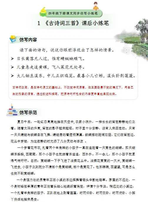 四年级下册的仿写练习开始引入古诗文的理解与再创作。以《古诗词三首》为例,要求学生读诗后想象诗句描绘的情景,并用自己的语言再现画面。例如,“日长篱落无人过,惟有蜻蜓蛱蝶飞”被还原为夏日午后宁静乡村的画面:红日高悬,农舍静立,蝴蝶在花丛中穿梭,蜻蜓在水面低飞。通过这样的练习,学生能够加深对古诗意境的理解,并学会用现代汉语进行生动描述。