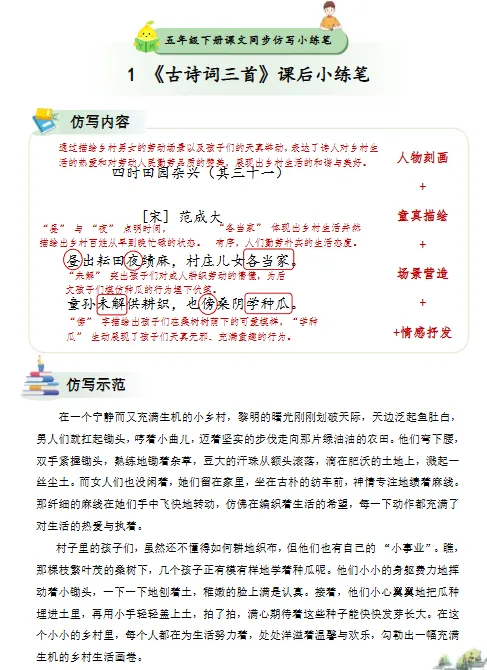 五年级下册的仿写内容进一步拓展到人物刻画、心理描写和情节发展等方面。以《古诗词三首》中的《四时田园杂兴》为例,分析了诗中农民劳作的场景,如“昼出耘田夜绩麻,村庄儿女各当家”,并通过仿写示范展示了如何将诗歌中的生活画面转化为具体的叙事描写。例如,描述一个充满生机的乡村清晨,人们在田间劳作,孩子们在玩耍,整个村庄洋溢着勤劳与和谐的气息。这类练习有助于学生掌握记叙文的基本要素,提升写作的条理性和感染力。