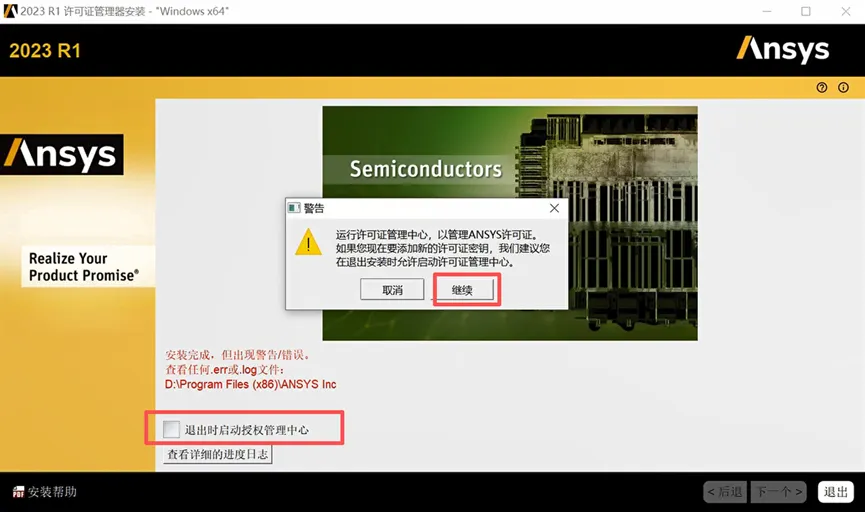 22.去掉【退出时启动授权中心】前的√,弹出窗口选择【继续】