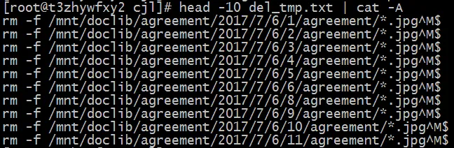 也可以通过命令行 head -10 del_tmp.txt | cat -A来进行查看,如下: