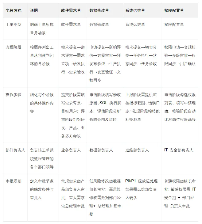 我们需要将规划以表格的形式可视化,这样可以清楚制定各类工单的全流程节点,操作规划和流转规则。清楚知道各环节责任主体,作为开发的关键文档和系统配置。其内容如下: